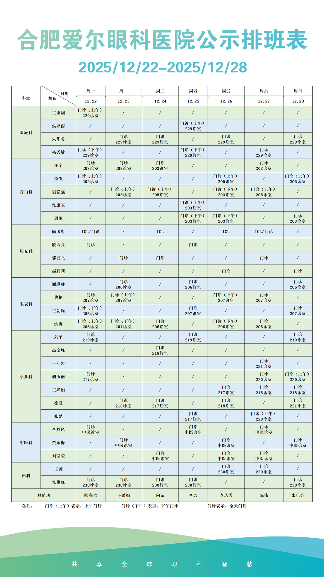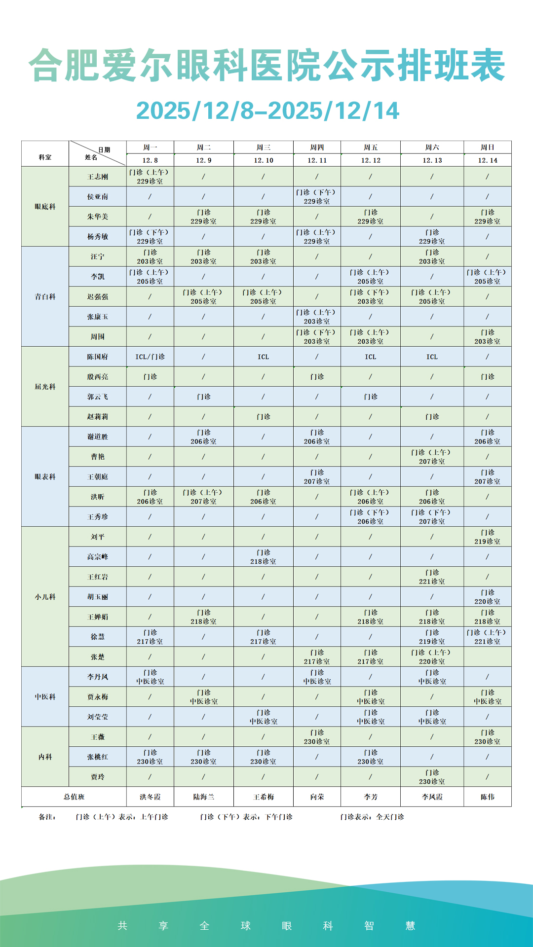 青白科:刘勇(安徽省区副总院长 业务院长 主任医师)、李凯(合肥爱尔眼科副院长、白内障、青光眼科专家 主任医师)、汪宁(白内障、青光眼科专家 副主任医师)、张康玉(青白科专家 副主任医师)、迟强强(青白科医师、副主任医师)